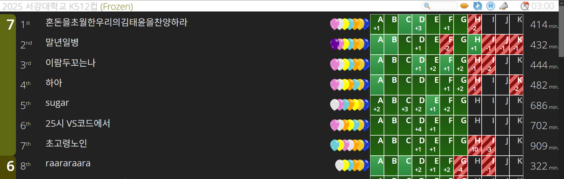 이대로 59분이 남았는데 누군가가 H까지 풀지 않을까 해서 무서워서 H를 건드렸고, 어떤 원소의 앞뒤를 확인하는 DP를 짜면 될 것 같아서 그렇게 했는데 계속 틀리고 그대로 폭사하였다. 풀이가 틀린 이유를 대회 끝나기 1초 전에 깨닫고 그대로 대회가 끝났다.