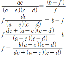 cout << fixed << (double)(b*(c-d)*(a-e)*1.0/(d*e*1.0+(c-d)*(a-e)*1.0));