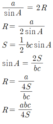 R = 외접원의 반지름, a,b,c=각 변의 길이, S=넓이