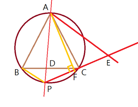 정삼각형이 되는 이유는 삼각형 ABP와 삼각형 ACE가 합동이므로 각 PAE가 60도, 선분 AP, AE가 같기 때문이다.